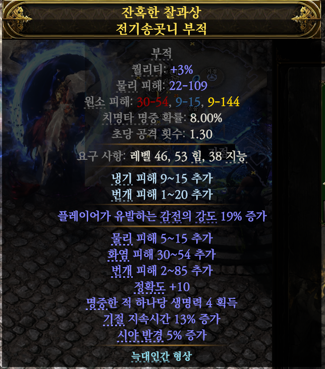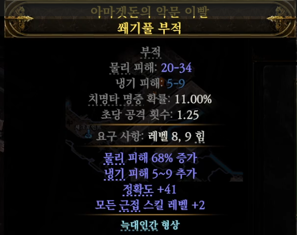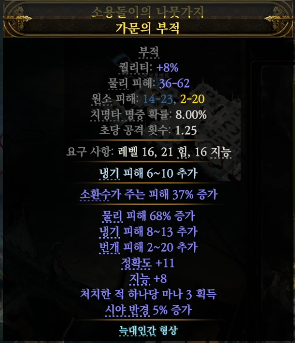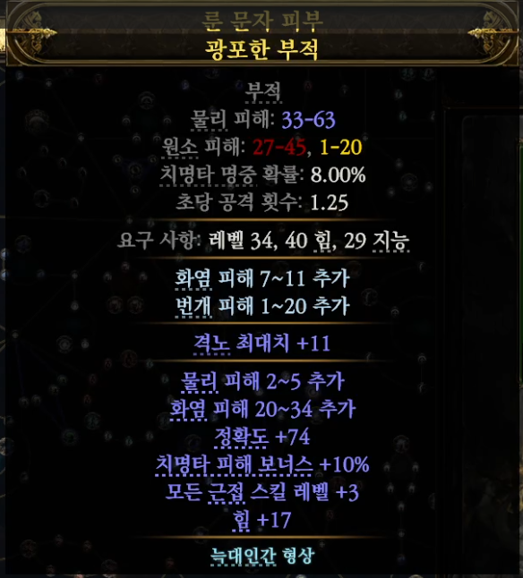 - 플랫데미지(화염, 냉기, 번개, 물리 피해 #-# 추가 > 물리피해%증가 > 공격속도 > 근접 스킬 레벨)