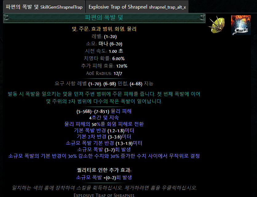 빌드를 그대로 따라한다면 원래는 폭발덫을 변성젬인 파편의 폭발덫으로 사용해야 하는데 극초반에 구하기가 껄끄로울거 같아서 안썼어요. 마찬가지로 극초반에 이정도 아이템은 못구할거같은데? 싶은건 최대한 안썼습니다.