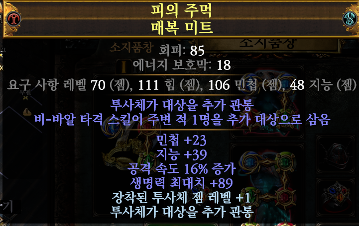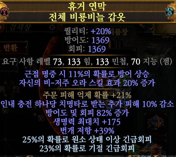 1. 카오스저항이 분열된 민첩 베이스를 구매합니다. (아이템레벨은 저항 1티어를 위해선 84렙을 사야하나, 2티어 72렙도 충분합니다.)