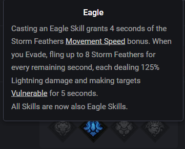 2. 피하기 사용시, 매초마다 최대 8개의 storm feather를 날려 125%의 번개 데미지를 주고, 적을 5초동안 취약하게 만듭니다.