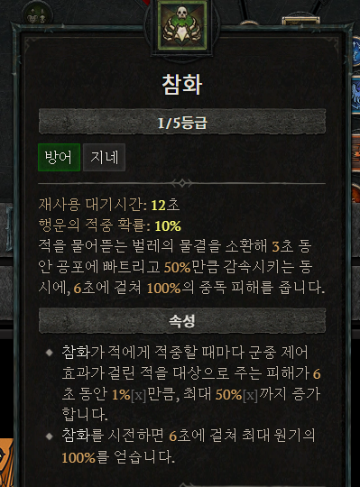어스름의 위상 : 적을 군중제어 상태로 만들면 = 참화스킬 사용시(감속,공포) 주자원을 회복합니다. - 반지 (메마른 평원의 용사의 전당에서 확정 획득 가능)
