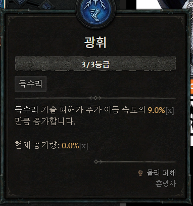 광휘라는 패시브 노드로 독수리 스킬 사용시 (즉 모든 스킬 사용 시) 이동속도 9%에 비례한 데미지 증가