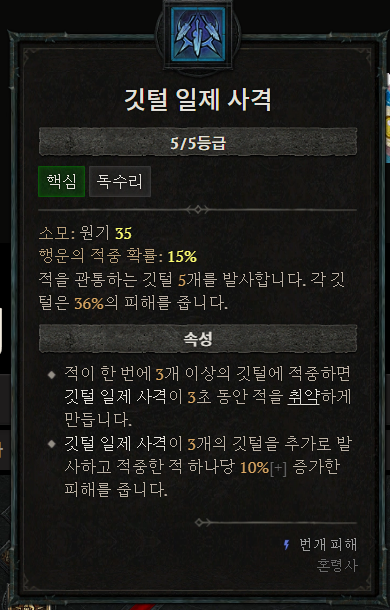 이러한 고유지팡이로 핵심스킬 (깃털 일제사격)을 기본스킬화하여 난사할수 있게되고