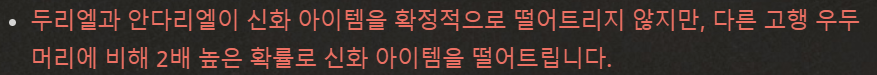 ※ 신화고유는 모든 우버보스에게 공통으로 드랍되며, 안다리엘과 듀리엘은 신화고유 드롭율이 2배입니다.