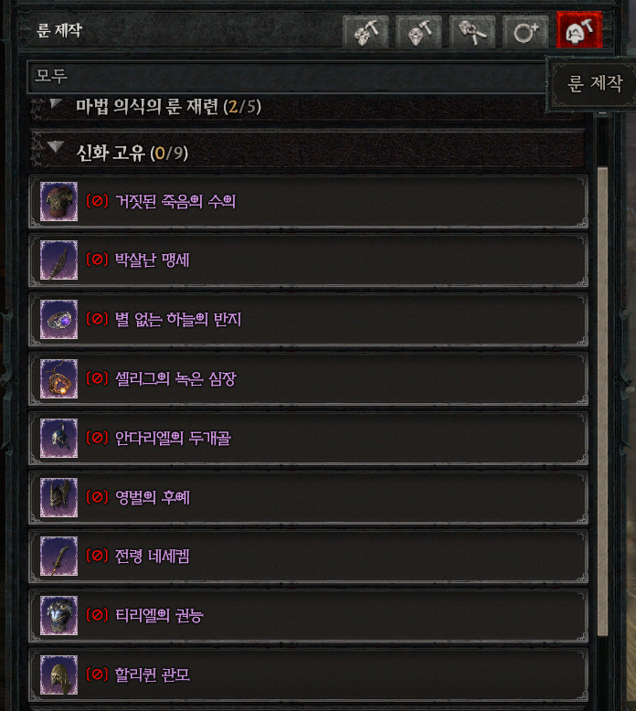 직업 신화고유 공통 서슬판금, 만용, 엔의 축복 야만용사 아리앗의 자세, 라말라드니의 역작, 과잉 살상, 못생긴 놈 투구 드루이드 야생심장의 갈망, 살점 분쇄봉, 묠니르의 반지 강령술사 크루울의 포옹, 피 장인의 흉갑, 각성의 벽 도적 건달의 입맞춤, 아시아라의 칸자르, 투기장 싸움꾼의 사기 원소술사 조각난 겨울유리, 에사도라의 넘실거리는 카메오, 시드헤 구속구 혼령사 우셰 낙 파, 첫 숨결의 가락지, 적황색 갑각 4. 신화고유를 제작으로 얻는방법