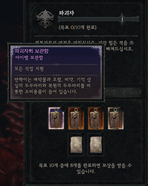 직업 신화고유 공통 푸른서슬, 신 살해자 왕관, 명명걸음, 티볼트의 의지, 크팔의 부식된 인장, 영혼 낙인, 추방된 군주의 영물 야만용사 위대한 조리츠의 엄니 투구 드루이드 폭풍의 포효, 고인돌 강령술사 검은 강, 핏빛 달의 무릎바지 도적 이름 없는 자의 머리쓰개, 건달의 가죽옷 원소술사 화염흉터, 푸른 장미 혼령사 케펠레케의 막대, 세파존텍 바르샨