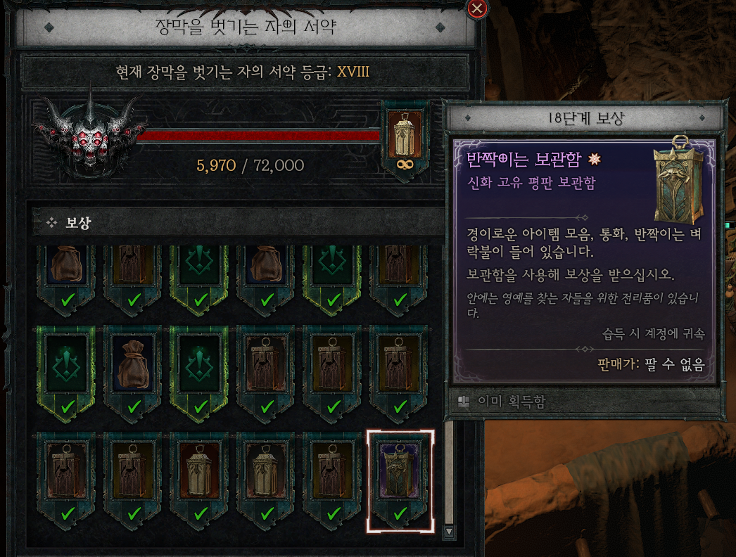 직업 고유아이템 공통 푸른서슬, 신 살해자 왕관, 명명걸음, 티볼트의 의지, 크팔의 부식된 인장, 영혼 낙인, 추방된 군주의 영물 야만용사 위대한 조리츠의 엄니 투구 드루이드 폭풍의 포효, 고인돌 강령술사 검은 강, 핏빛 달의 무릎바지 도적 이름 없는 자의 머리쓰개, 건달의 가죽옷 원소술사 화염흉터, 푸른 장미 혼령사 케펠레케의 막대, 세파존텍, 태양새의 목가리게 안다리엘
