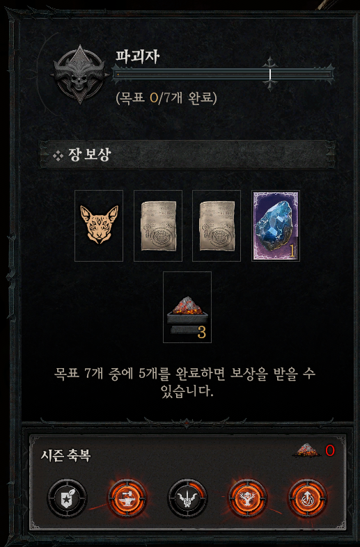 듀리엘 고통의 파편 3개 안다리엘 바늘 꽂이 인형 3개 벨리알 배신자의 껍데기 2개 증오의사도 혐오스러운 심장 3 그리구아르 살아있는 강철 12개 얼음속의 야수 정제된 공포 12개 지르 극상의 피 12개 바르샨 악의 심장 12개 우리바르 심판관의 가면 12개 ※시즌 8부터는 "우버보스 소환 자체는 무료"이며, "보스를 잡고 난 후 보상상자 오픈 할때 재료가 필요" 합니다.