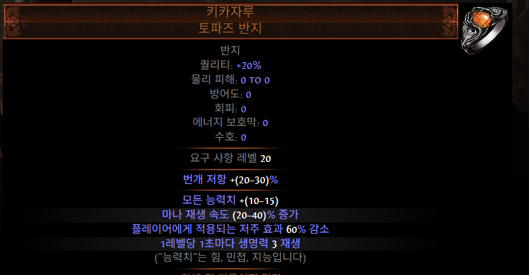 - 방어구 : 화염저항,생명력최대치,부족한저항(카오스저항)