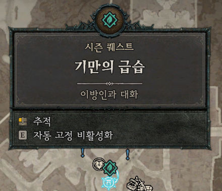 시즌 캐릭 생성직후, 맵을 열면 위 이미지처럼 초록색 나뭇잎 아이콘의 퀘스트가 나옵니다. 이 퀘스트를 자연스럽게 따라가시면 됩니다. 시즌을 하시려면 무조건 1회 클리어해야 하기 때문에, 레벨업 효율과 상관없이 레벨링 구간에서 미리 깨는게 좋은 경우가 대부분입니다.