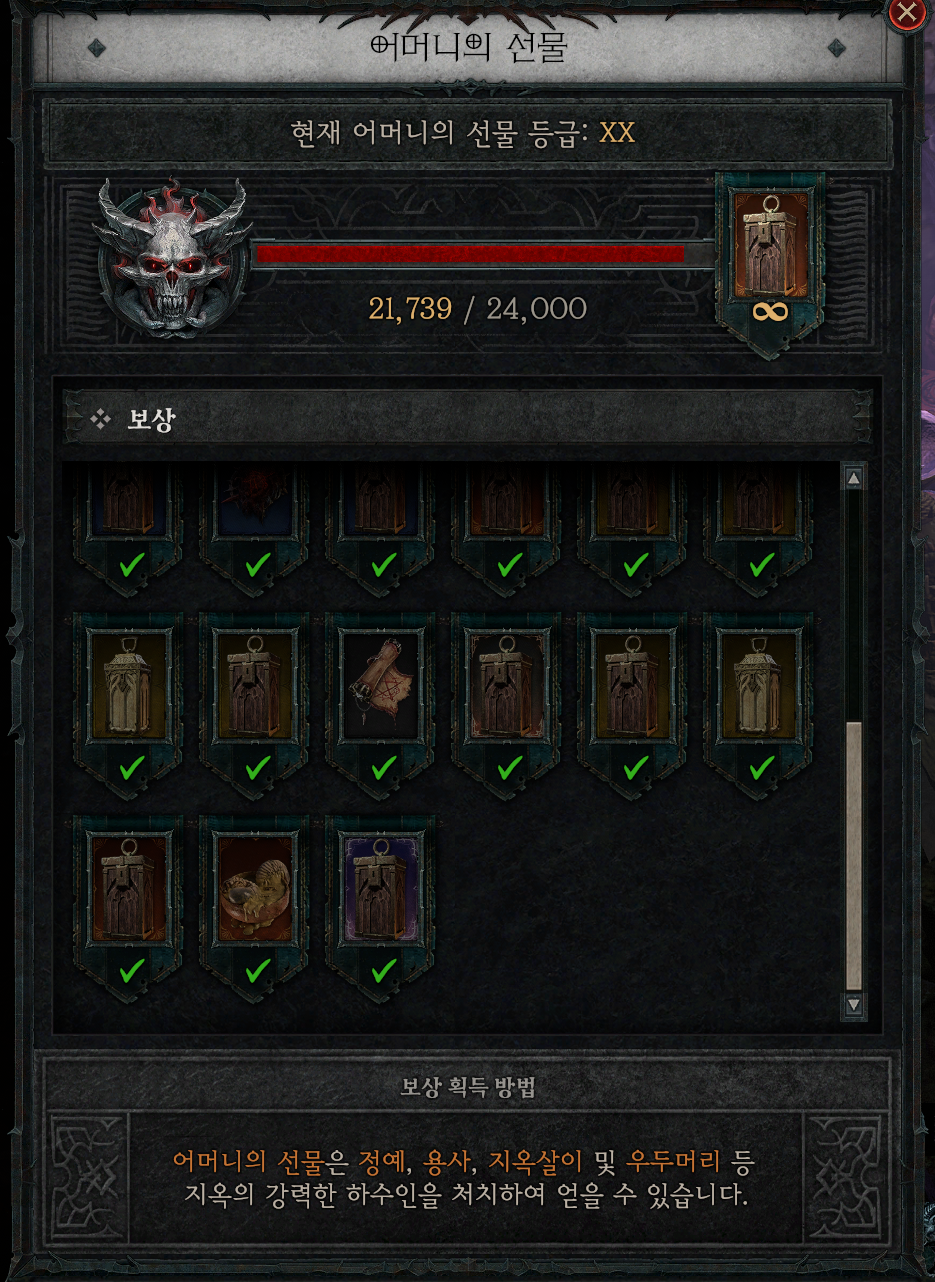아래와같이 극초반에는 어머니의선물, 시즌여정으로 보스 소환재료를 다양하게 다량 제공합니다. 극초반 신화고유 아이템 파밍에 적극적으로 활용하세요.